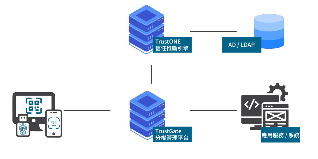 Slide零信任解決方案即時驗證 及時阻斷拒駭客於門外 什麼是「零信任」 傳統網路安全好比你拿著一張通行證進入銀行,只要驗證一次,之後金庫、櫃檯、VIP室都可自由進出。零信任架構則不同,它假設任何人、任何設備都有可能被冒用,就像每一個金庫的門、每一次提款都需要再次驗證-除了核對身分證件,還會檢查你當下的信用狀態、交易習慣,甚至確認你用的提款機是否安全。 零信任的核心實踐 持續驗證Continuous Verification 不論內外網路,每一次的存取都重新檢視身份、裝置健康狀態與風險分數。 動態授權Adaptive Access Control 每次存取皆動態授權,依即時風險決定是否放行或加強驗證。 微分段Micro Segmentation 就像金庫被分隔成許多小隔間,攻擊者即使入侵某一區,也無法輕易橫向擴散。 政府零信任架構 2020 年美國國家標準技術研究院 NIST 頒布 〈SP 800-207〉,為產業發展奠定基礎。2024 年資通安全研究院(隸屬數發部)公告〈政府零信任架構〉,規範政府機關導入零信任架構的規格,使公私部門得以依循相關標準。TrustONE ZTA 零信任架構,完全依照資安院公告標準,以決策引擎為核心,透過 TrustGate 存取閘道提供即時驗證的加密連線通道。 TrustONE ZTA 零信任架構同時適用於機構對內、對外線上服務,亦適用於核心主機、資通關鍵基礎設施,實現無邊界、不依賴任何單一節點的安全保障。 零信任三大核心 身份鑑別 驗證、管理使用者身份。 TrustONE ZTA 支援MFA(E-mail 或 OTP)、FIDO 生物特徵辨識。 設備鑑別 驗證連線的來源裝置。TrustONE ZTA 支援讀取設備 TPM、軟體式 TPM,為每個連線設備驗證獨一無二的「指紋」。 信任推斷 基於評估分數,允許或禁止連線。以連線時間、地點、裝置環境為推斷基礎,亦可由 EDR、XDR 取得風險評估。 TrustONE ZTA 運作架構 FIDO 無密碼身份鑑別 傳統的密碼驗證,不僅要求使用者記住數量多又複雜的密碼,而且已被多次實證並非安全可靠:駭客可以暴力嘗試破解密碼、誘騙或取得洩漏的密碼。TrustONE 支援 FIDO 標準無密碼驗證,全面升級到 AAL3 身份驗證機制,使用者可以使用實體 Token、PIN Code 或搭配預先綁定的手機實現指紋、臉部辨識登入。無密碼驗證讓使用者免於記憶、頻繁更換密碼之苦,更完全杜絕密碼洩漏導致的資訊安全危機。 Token / 智慧卡 以綁定的 USB Token 或感應卡、晶片卡作為驗證密鑰,該密鑰無法拷貝、偽造,每次驗證時皆需連接。 TrustONE ZTA 支援整合指紋辨識器的 Token。 Windows Hello 使用 Windows Hello 讀取比對使用者的臉部、指紋或 PIN Code 作為驗證身份的依據。 手機 FIDO 綁定 Android 或 iOS 裝置(無需安裝 App),每次驗證時,需以同一部裝置通過手機上的指紋、臉部辨識解鎖,即通過 TrustONE 身份驗證。 基於 TPM 的設備鑑別 在傳統的資安管理手段中,「限制特定設備方可連線」始終是困擾管理者的大課題。TrustONE ZTA 提供以信賴平台模組 Trusted Platform Module 為基礎的設備驗證機制,取得屬於連線設備獨一無二的「指紋」,確保連線來源不受偽造。 TrustONE ZTA 信任推斷 TrustONE ZTA 可依來源 IP、連線時間與地點、設備健康狀態進行信任推斷計算,作為允許/禁止連線的判斷依據,即時阻止高風險連線。可由管理者手動指定允許連線時間,亦可由 TrustONE ZTA 學習使用者的使用規律,主動偵測異常連線。TrustONE ZTA 會偵測使用者端的作業系統版本、更新狀態、防毒軟體與 GCB 合規狀態,動態計算信任分數。除了即時攔阻高風險連線,更為管理者提供有效的風險評估數據。 連線 IP / 地理位置 作業系統更新狀態 連線時間 GCB / GPO 套用狀態 防毒軟體狀態 由 EDR/XDR 取得資訊 完整支援 SAML2 / OIDC TrustONE ZTA 完整支援 SAML 2.0 與 OIDC,可作為身份驗證伺服器(IdP)為現有服務提供外部身份驗證;亦可作為消費方(SP)由現有身份驗證服務取得身份資訊。這意味著導入 TrustONE ZTA 之後,您不僅得到高規格的連線保護,還能快速為多個應用程式(支援SAML2/OIDC)部署單一登入服務(SSO);如果您的組織已經啟用 SSO,亦可令 TrustONE 從您現有的 SSO 服務取得身份驗證資訊,使用者無需改變使用習慣,避免資安或業務的陣痛期。 串接 AD / ADFS同步組織人員權限 整合現有 SSO 提供 SSO 服務